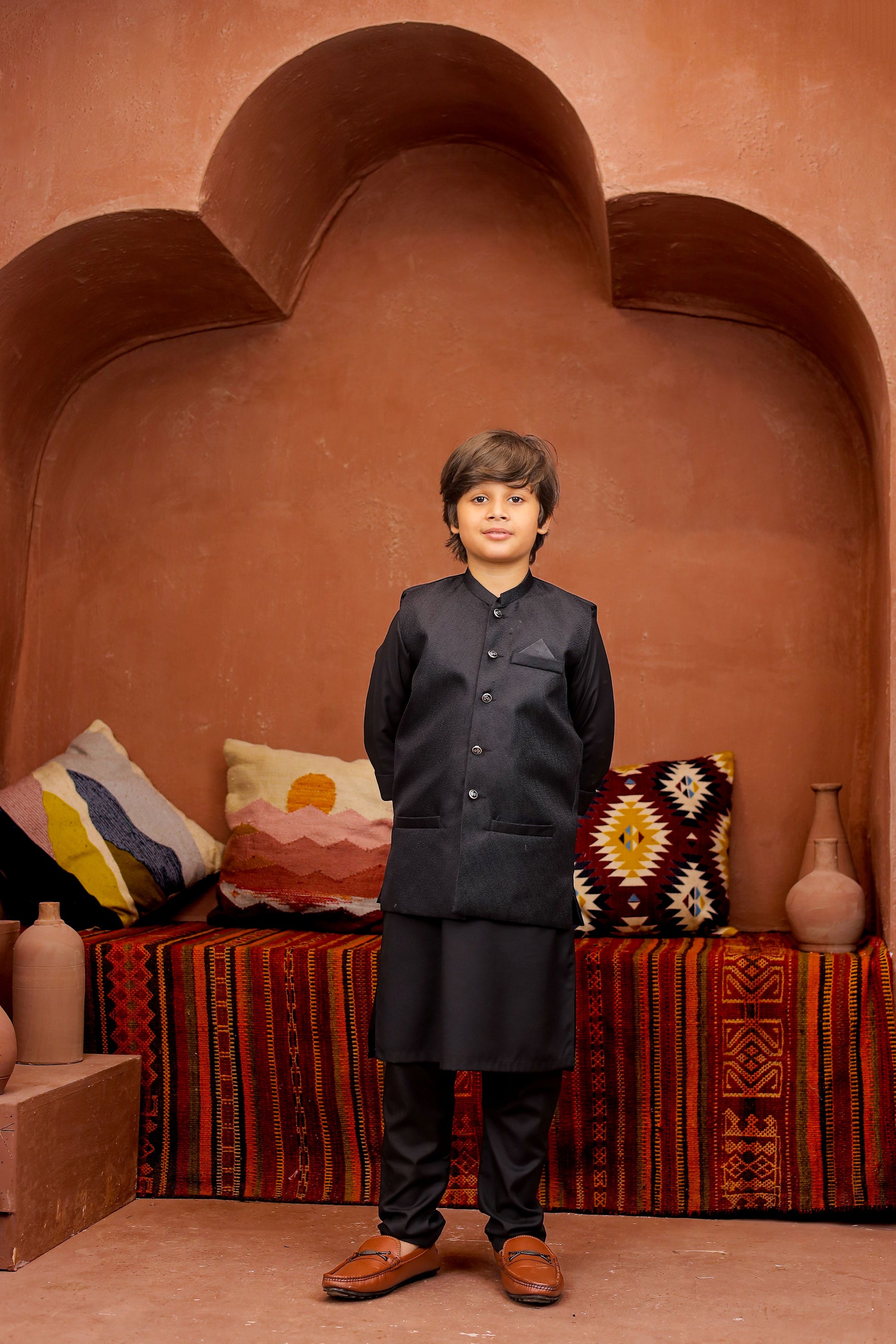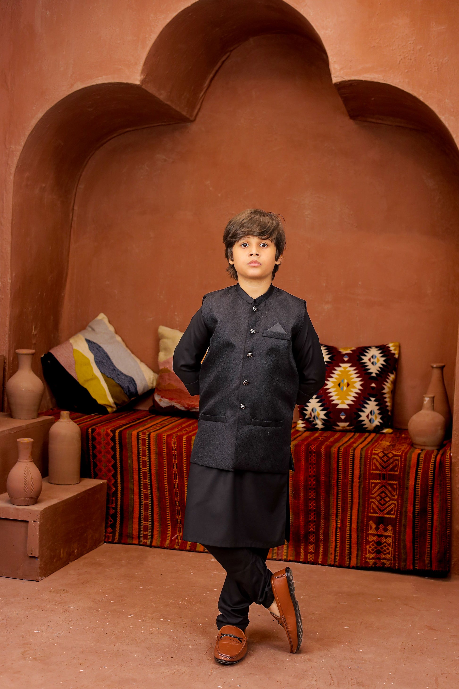 Introducing our Black 3-piece Formal Shalwar Kameez and Waistcoat set, tailored for boys with impeccable style and timeless Elegance, perfect for any special occasion.
