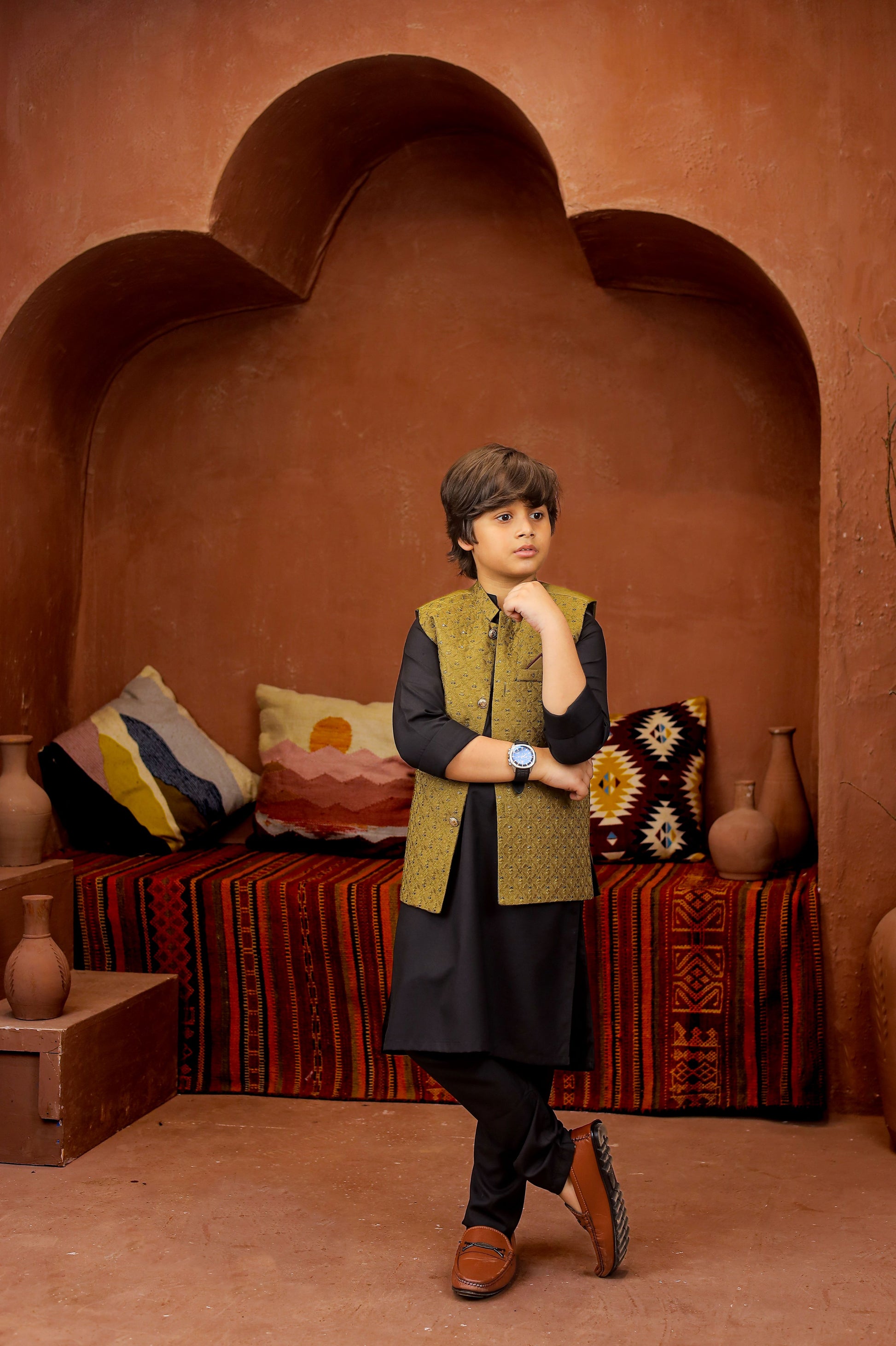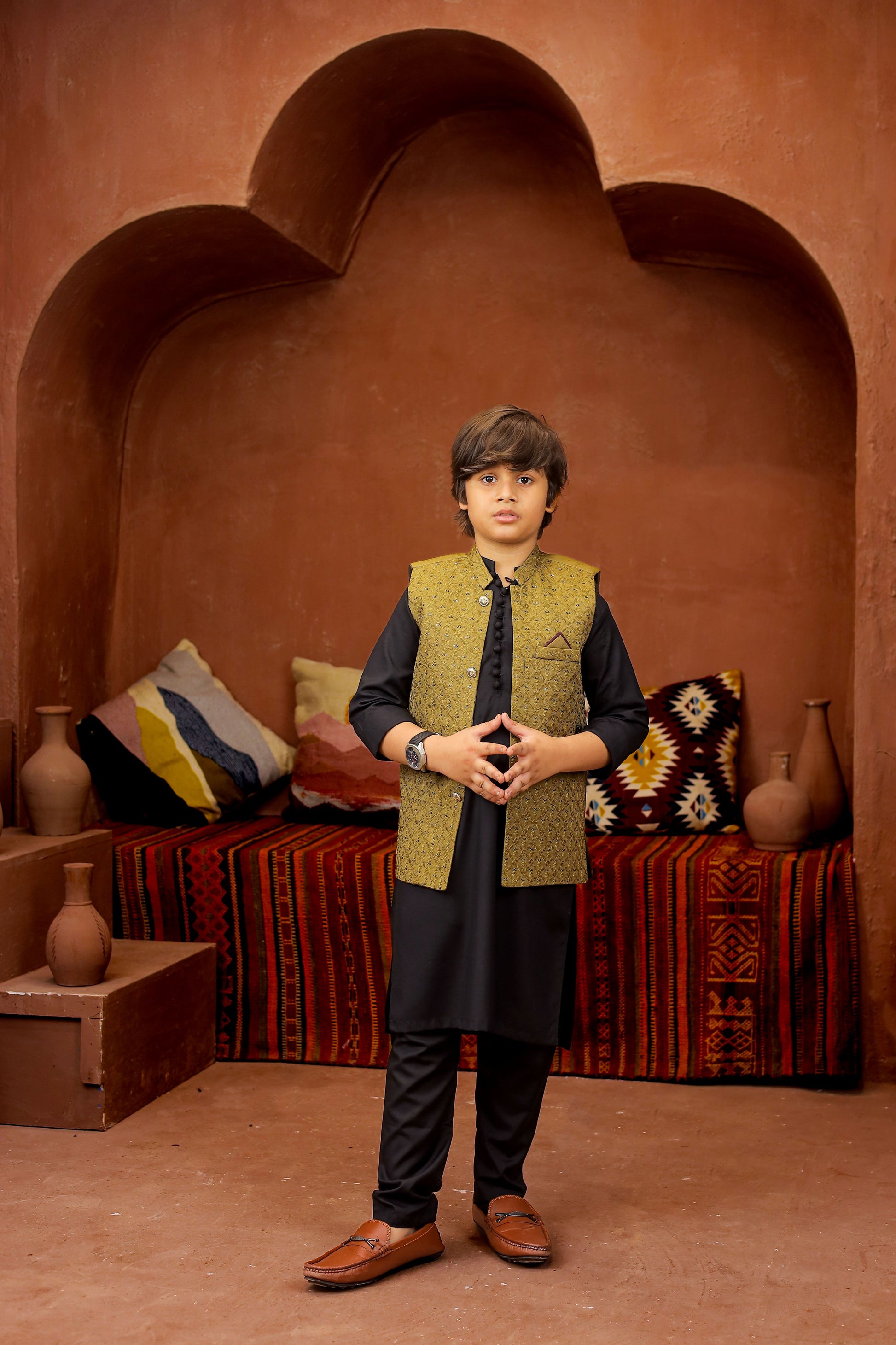 Introducing our Black 3-piece Formal Shalwar Kameez and Waistcoat set, tailored for boys with impeccable style and timeless Elegance, perfect for any special occasion.