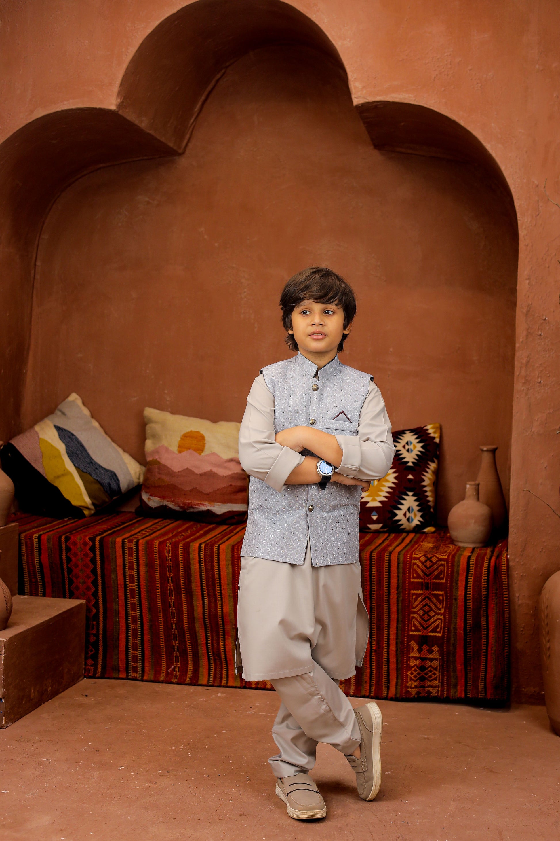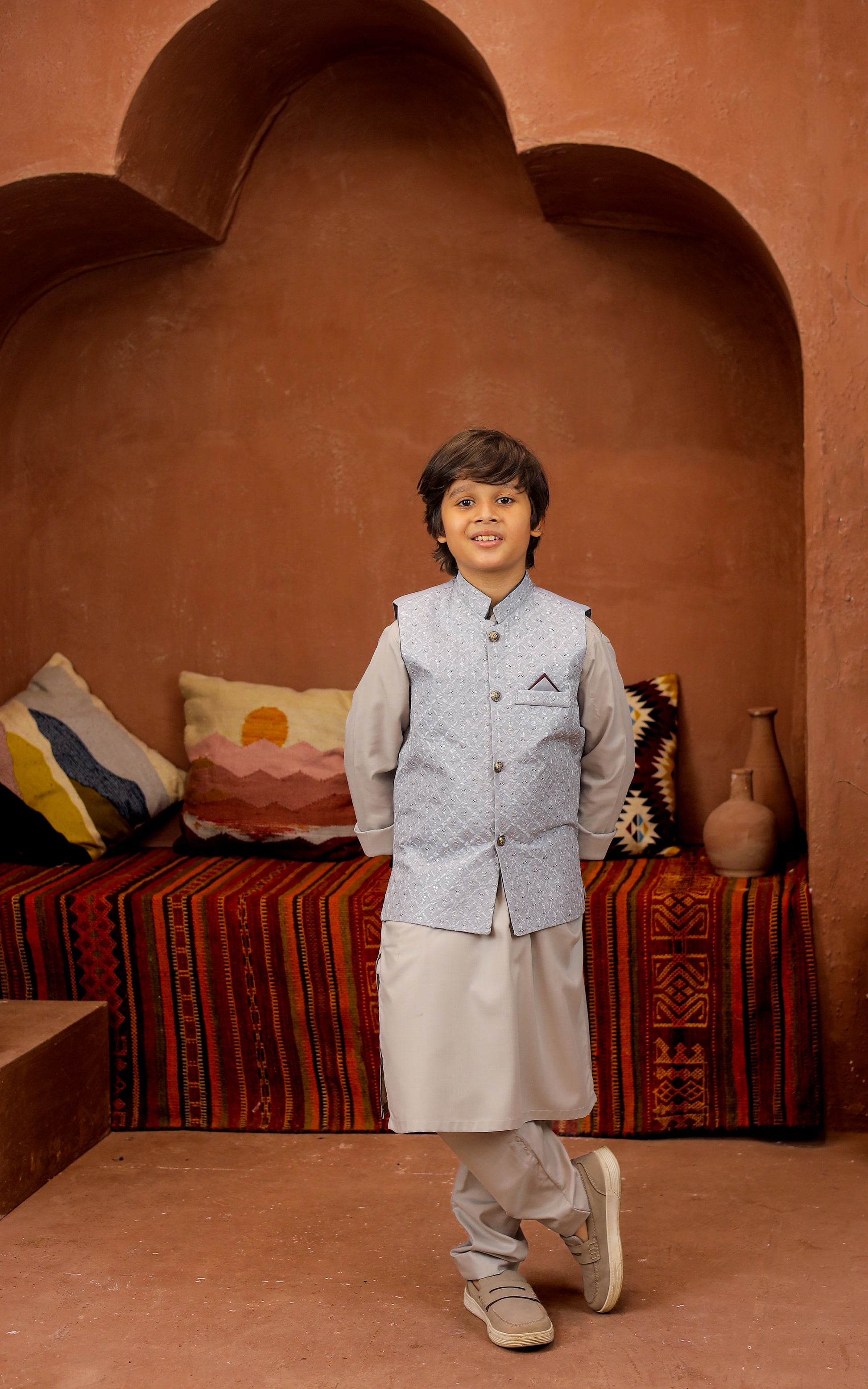 Introducing our Black 3-piece Formal Shalwar Kameez and Waistcoat set, tailored for boys with impeccable style and timeless Elegance, perfect for any special occasion.