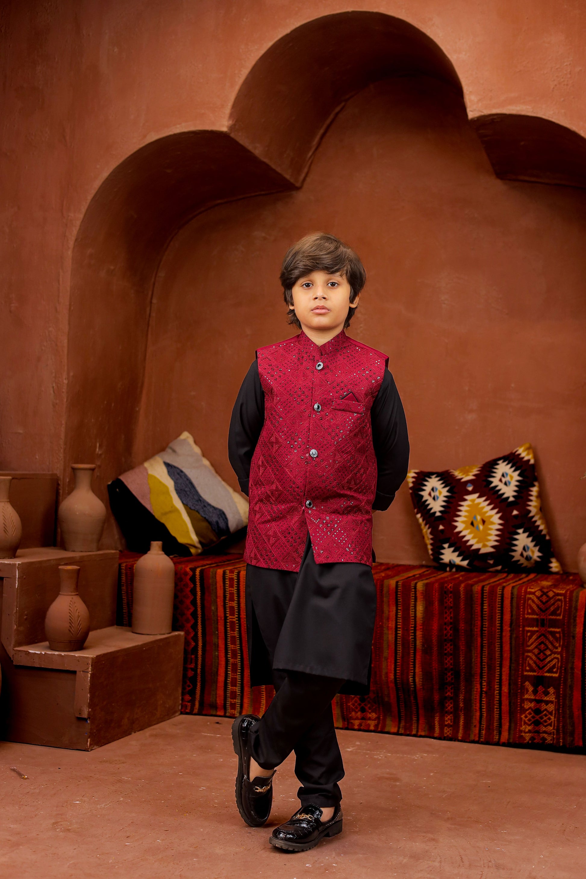 Introducing our Black 3-piece Formal Shalwar Kameez and Waistcoat set, tailored for boys with impeccable style and timeless Elegance, perfect for any special occasion.