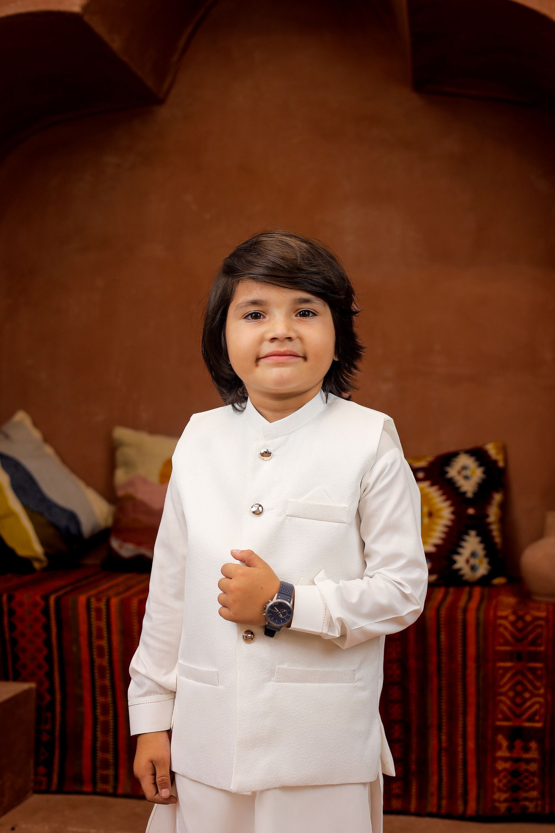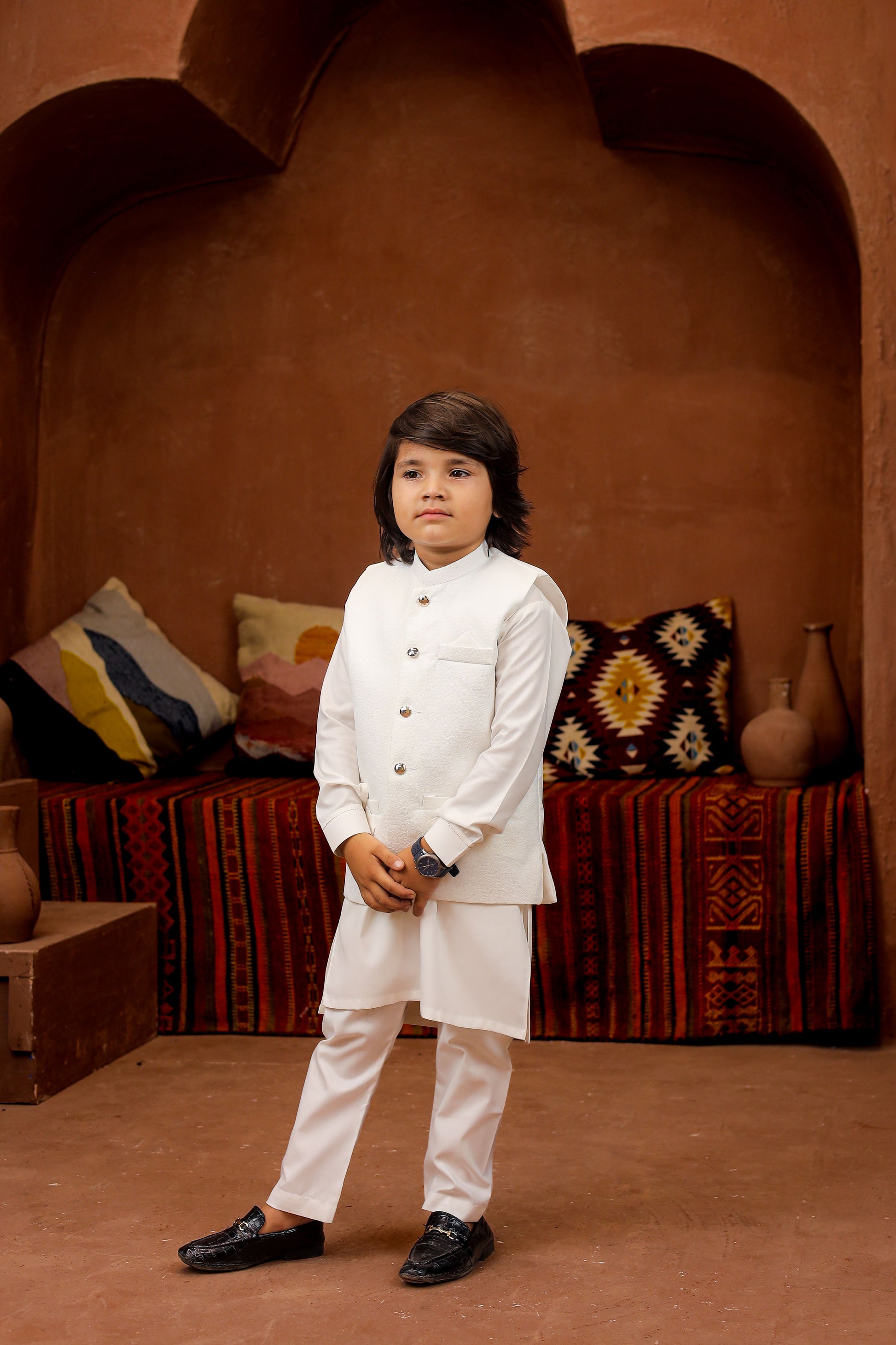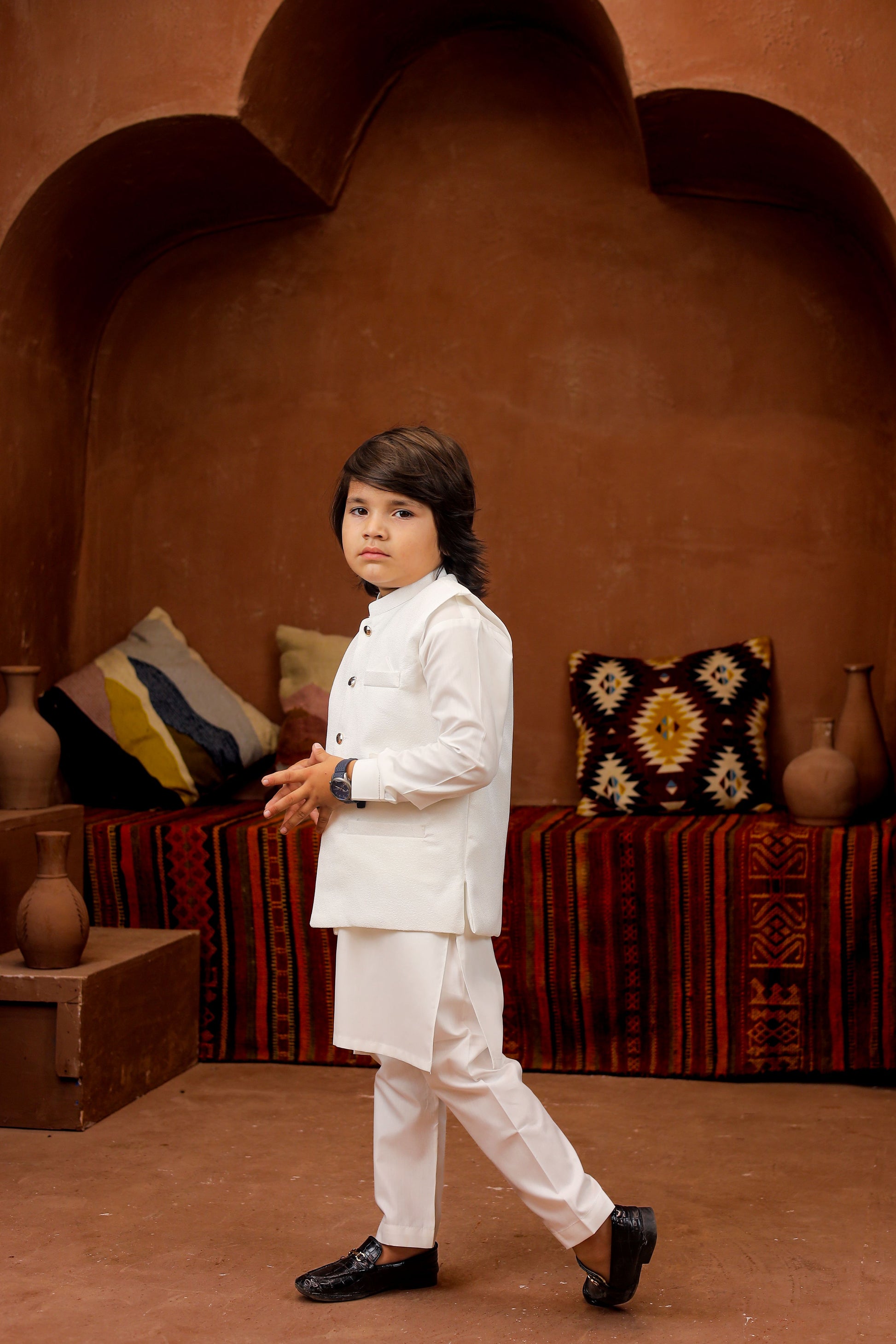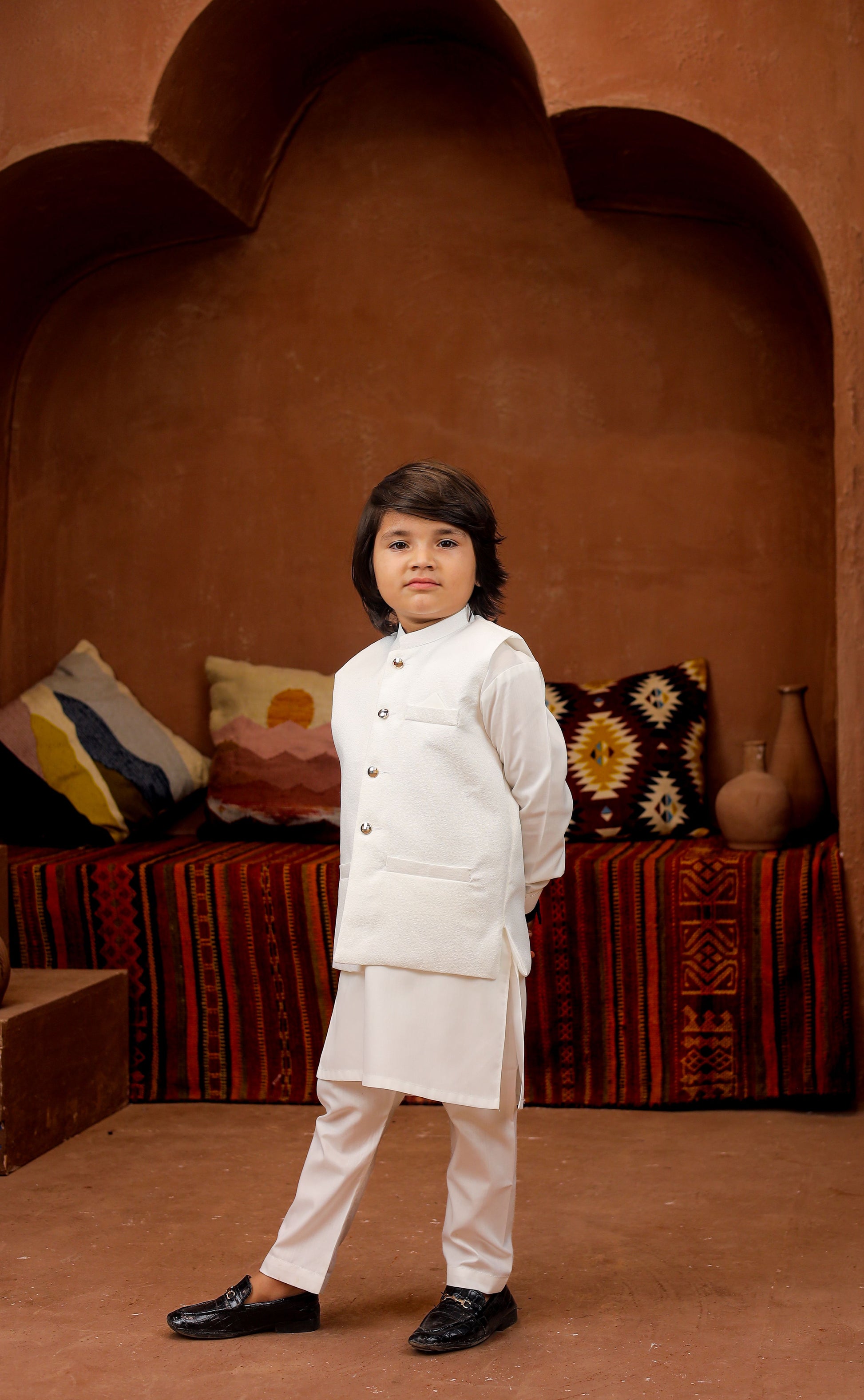 Introducing our Black 3-piece Formal Shalwar Kameez and Waistcoat set, tailored for boys with impeccable style and timeless Elegance, perfect for any special occasion.